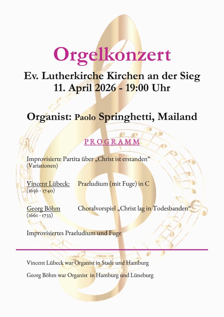 Orgelkonzert mit Paolo Springhetti in der Lutherkirche Kirchen am 11. April 2026 um 19.00 Uhr